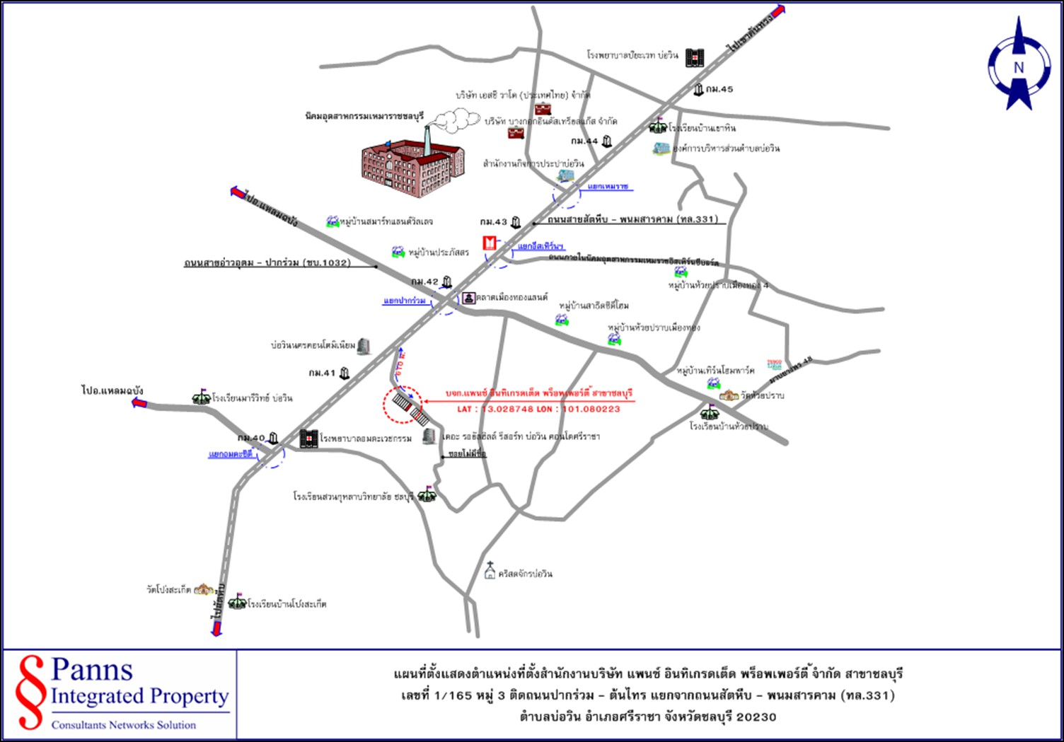เลขที่ 1/165 หมู่ 3 ติดถนนปากร่วม-ต้นไทร แยกจากถนนสัตหีบ-พนมสารคาม (ทล.331)